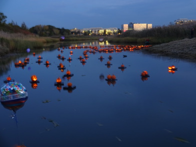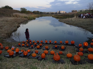 The annual Pumpkin Float will be held in Pope John Paul II Park on Thursday, October 20 at dusk. Show up by 5:30. Attendees' carved and lit Jack-O-Lanterns will be released around 6:00 pm. Pictures from last year are here. (Photos by Jessica Mink)
