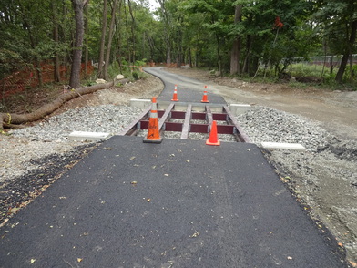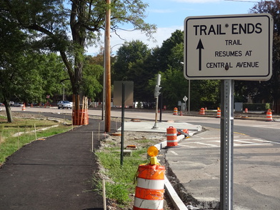 Construction is ongoing on a trail crossing of Blue Hill Parkway just south of Mattapan Square, and pavement is almost complete from the Harvest River Bridge to Central Ave. (Photos by Jessica Mink)